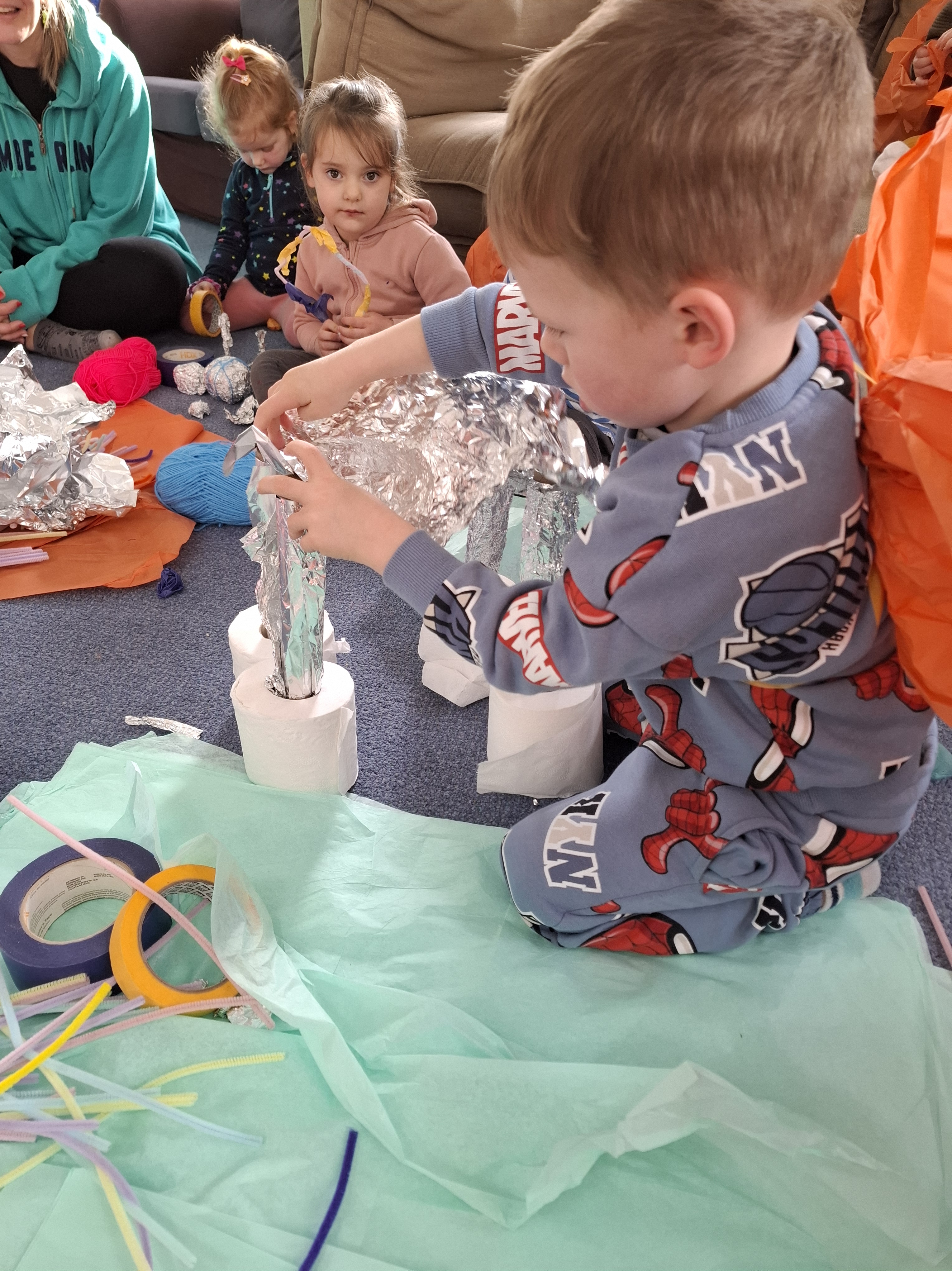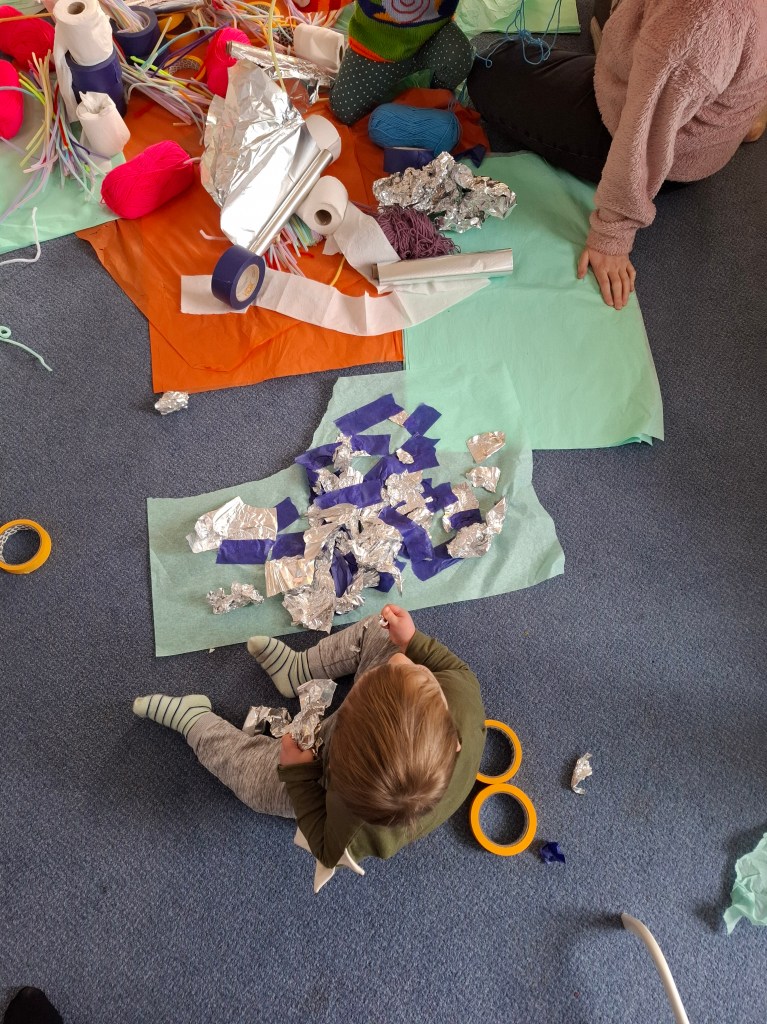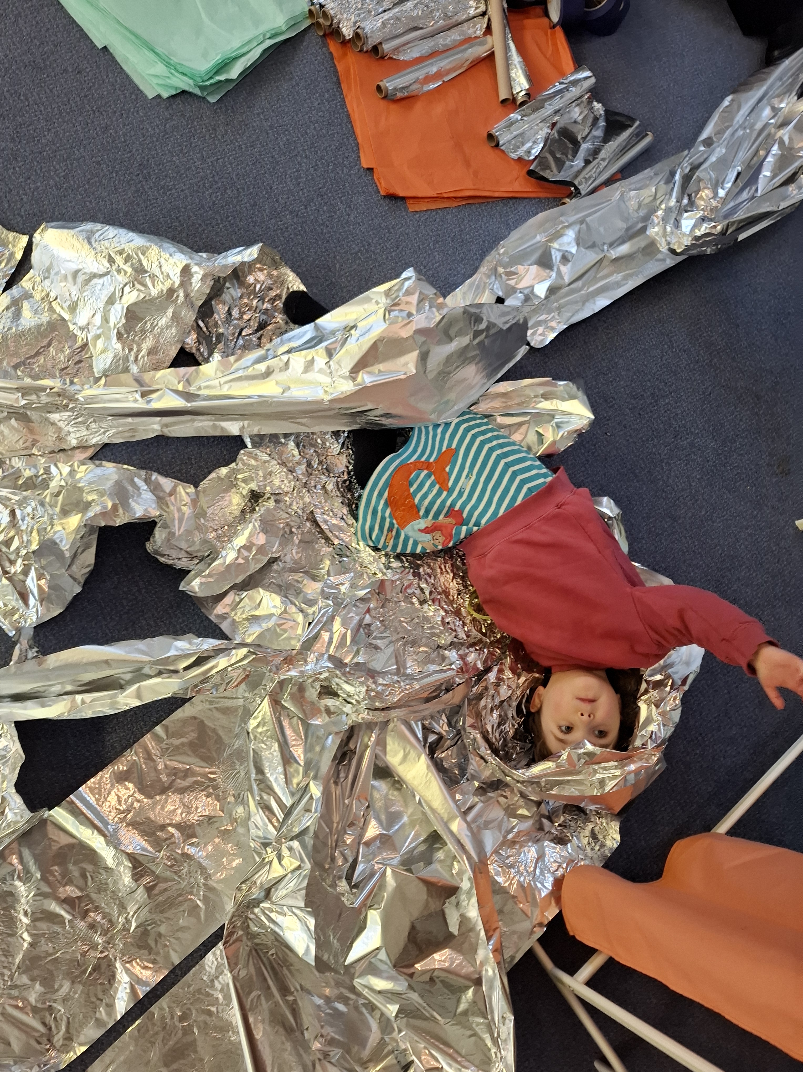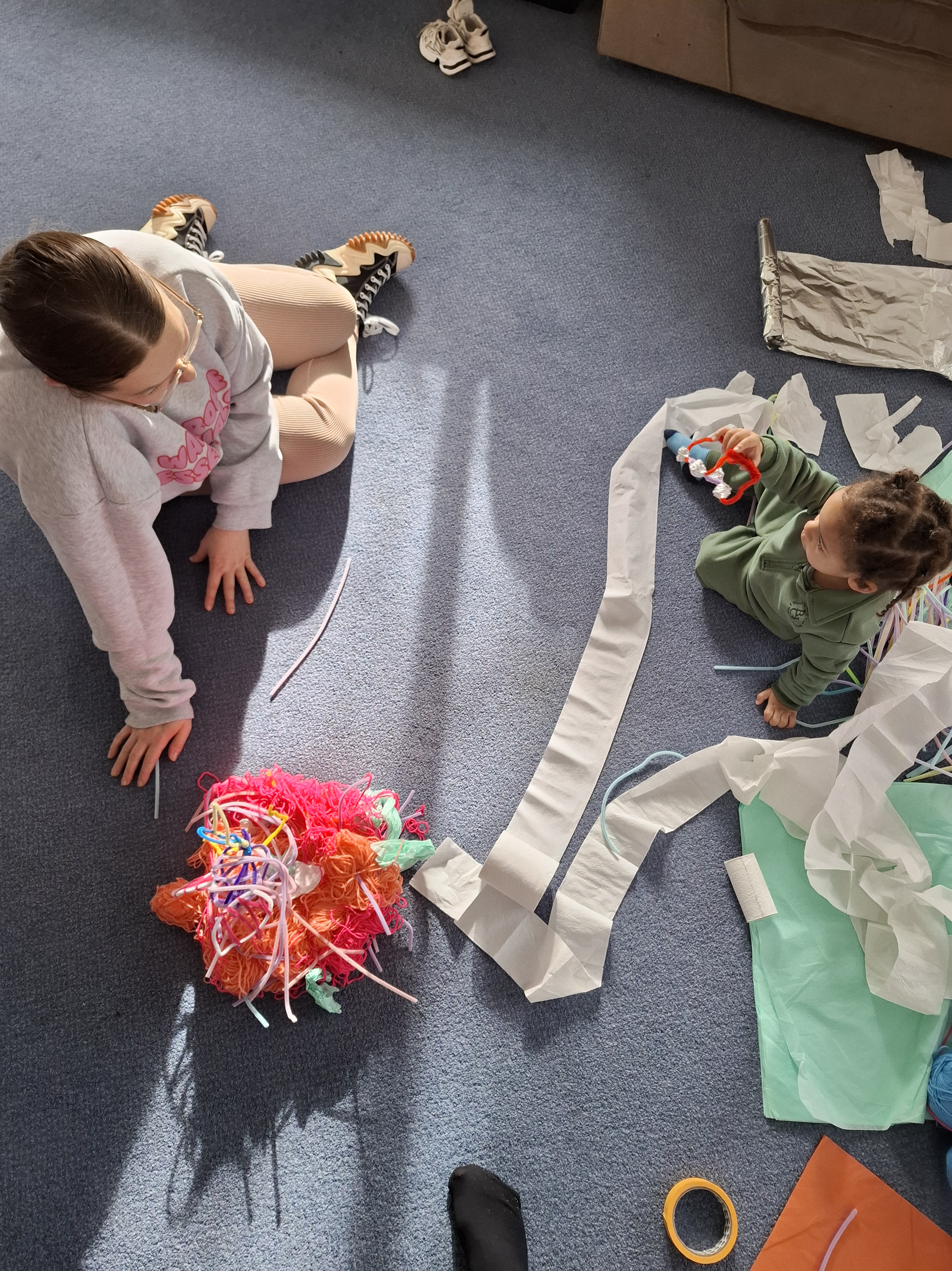 People made toys, costumes, sculptures and play environments. We made balls to play catch. We made dens to hide inside. We tangled ourselves up with wool. We made footprints on tin foil.