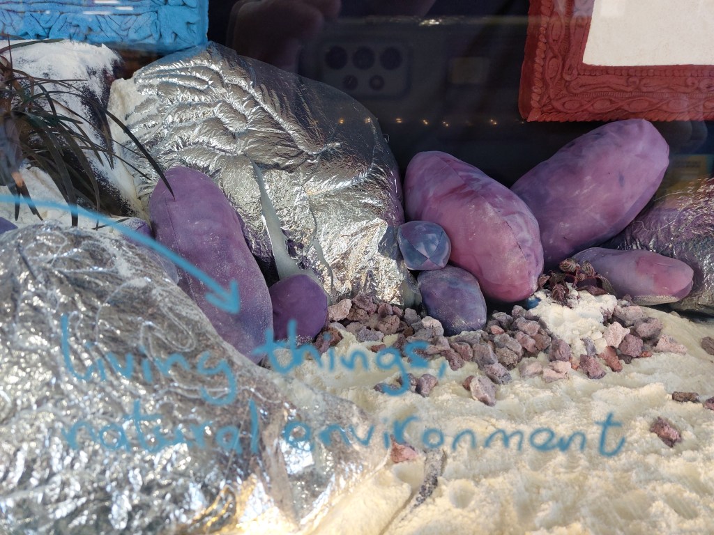 All works were created from materials already in my home: plastic packaging; broken umbrella; quilt batting; powder fabric dye; spray paint; nail polish; thread; salt; flour; water; acrylic paint; live plants; piano backing fabric; old curtain; silver emergency blanket; cotton fabric; bedsheets.