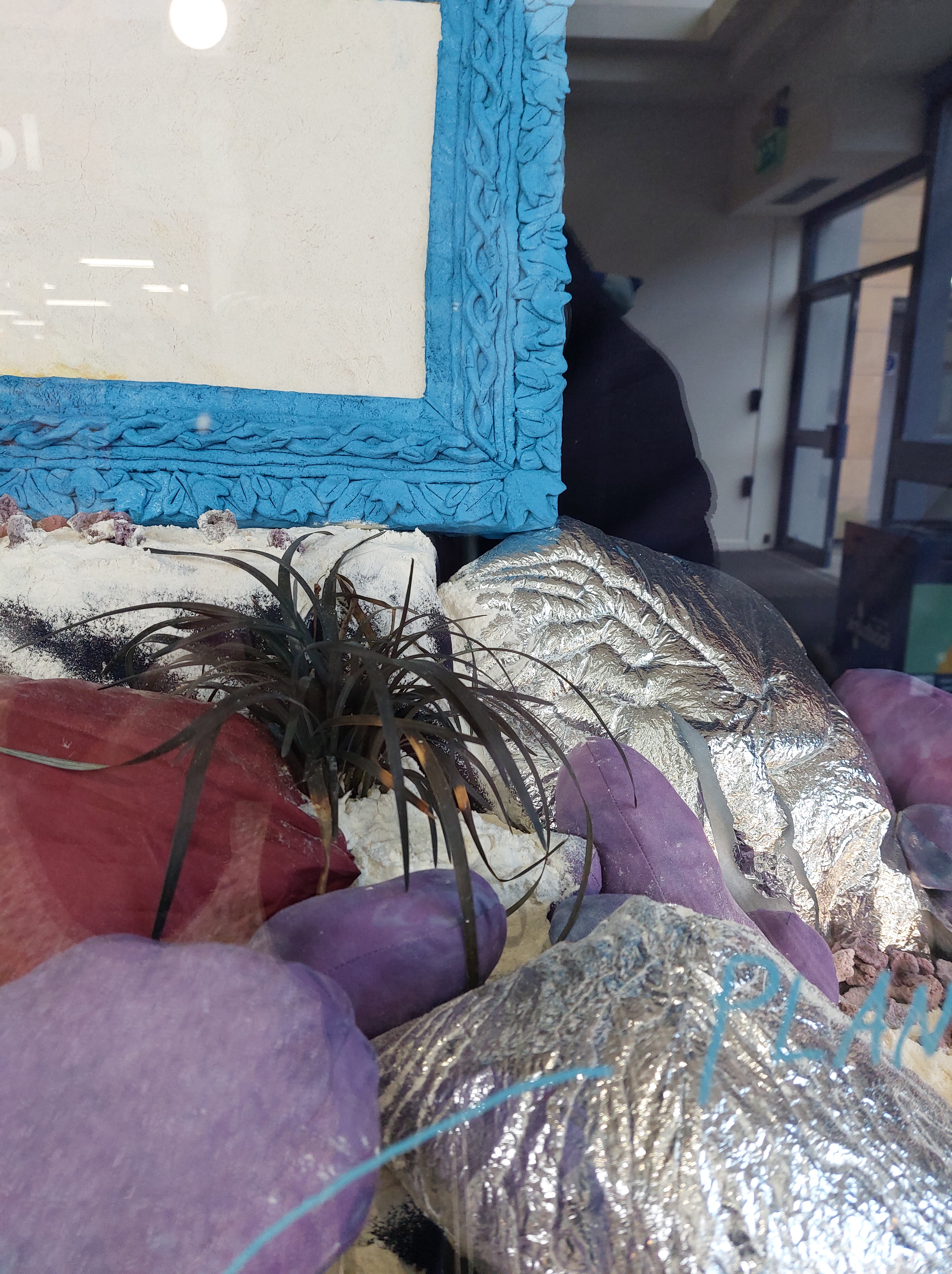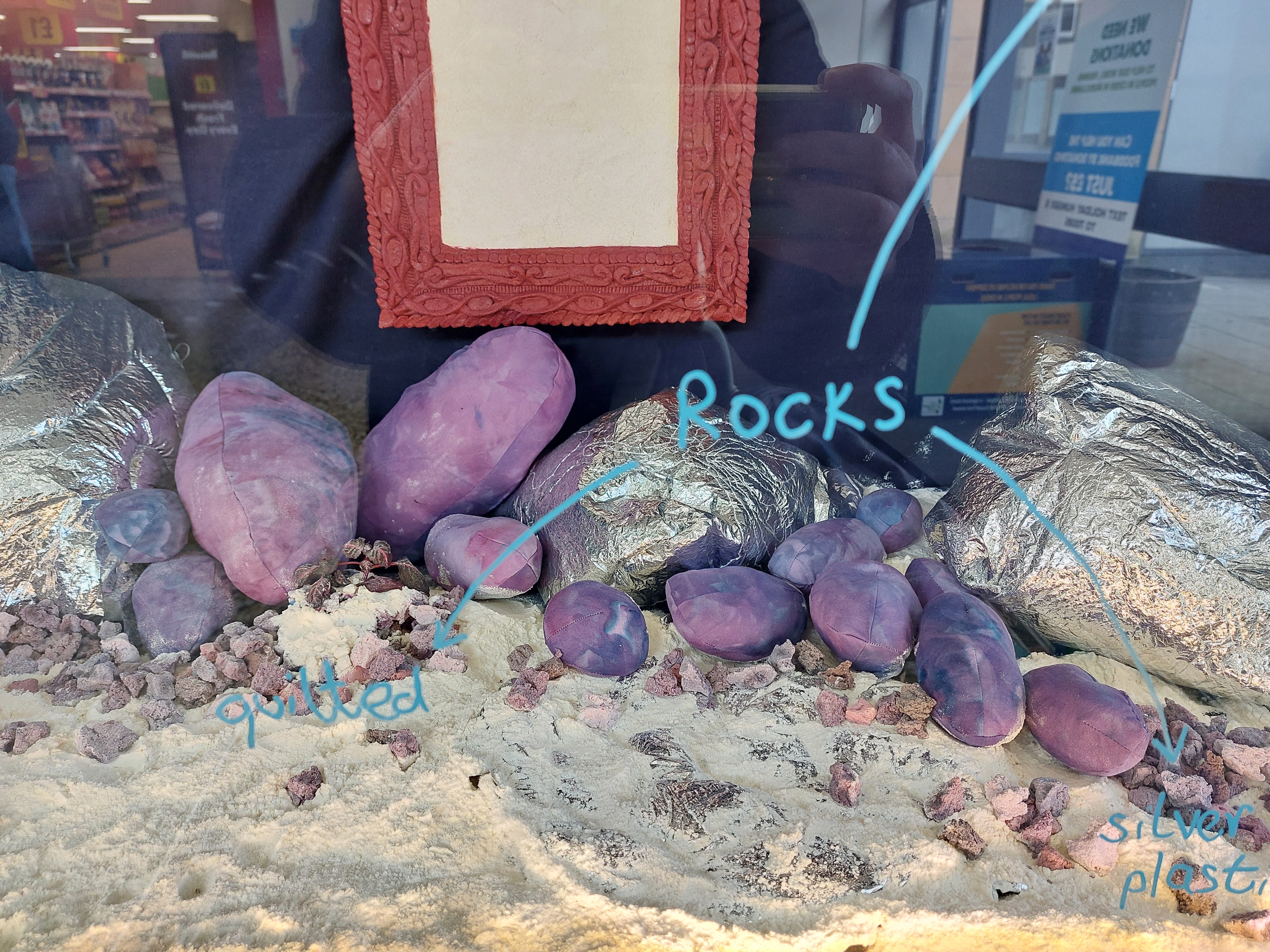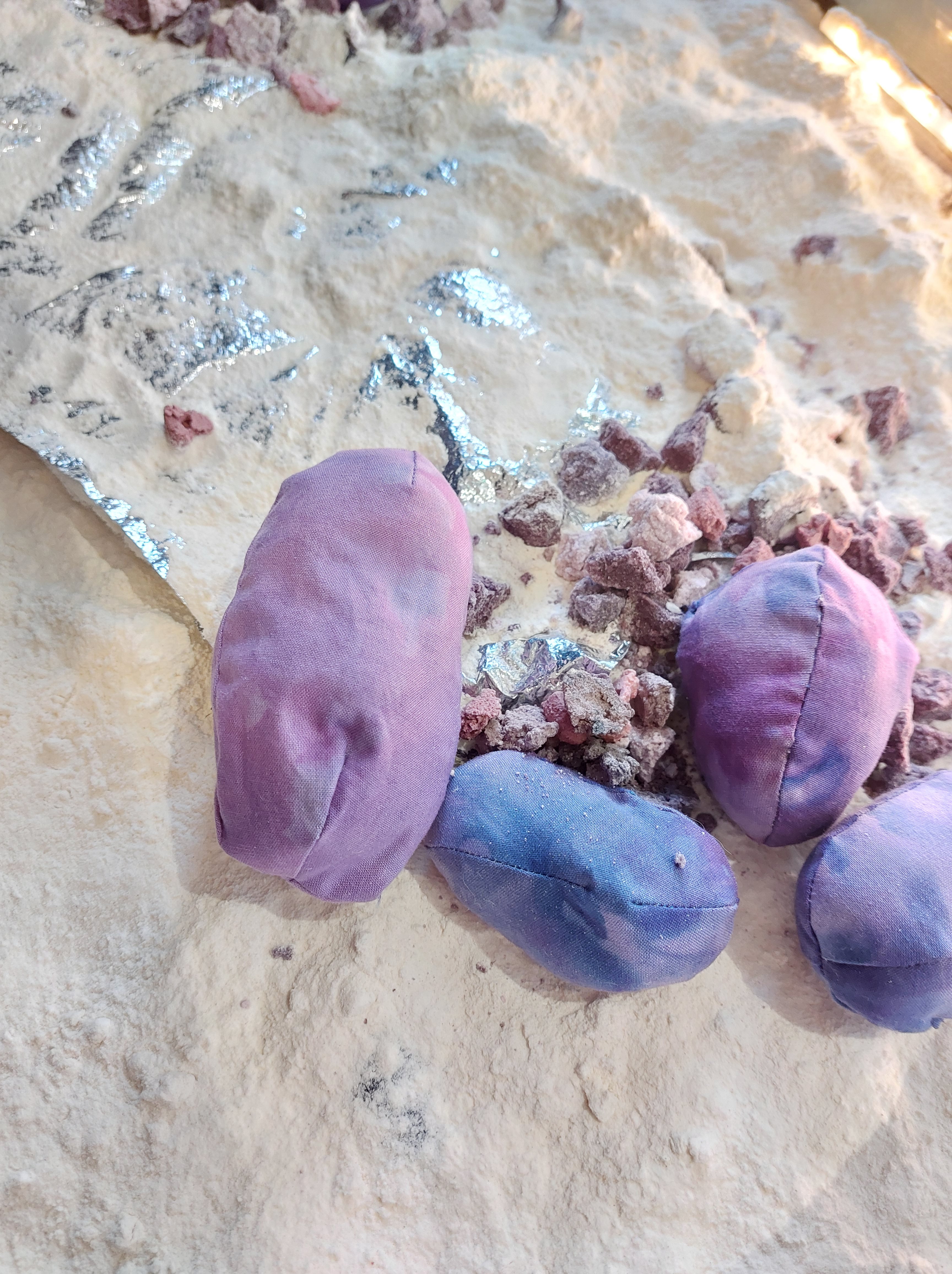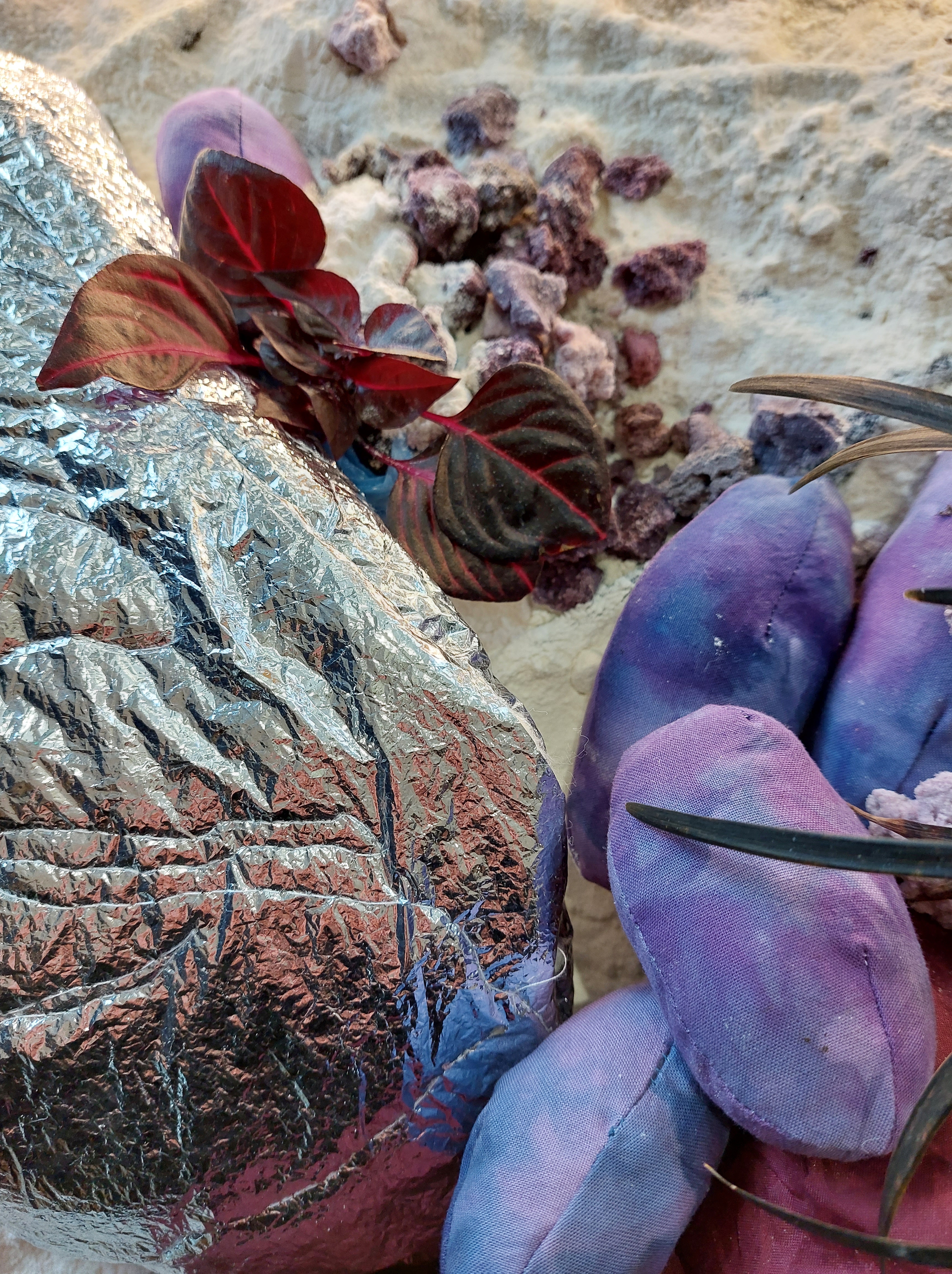 All works were created from materials already in my home: plastic packaging; broken umbrella; quilt batting; powder fabric dye; spray paint; nail polish; thread; salt; flour; water; acrylic paint; live plants; piano backing fabric; old curtain; silver emergency blanket; cotton fabric; bedsheets.
