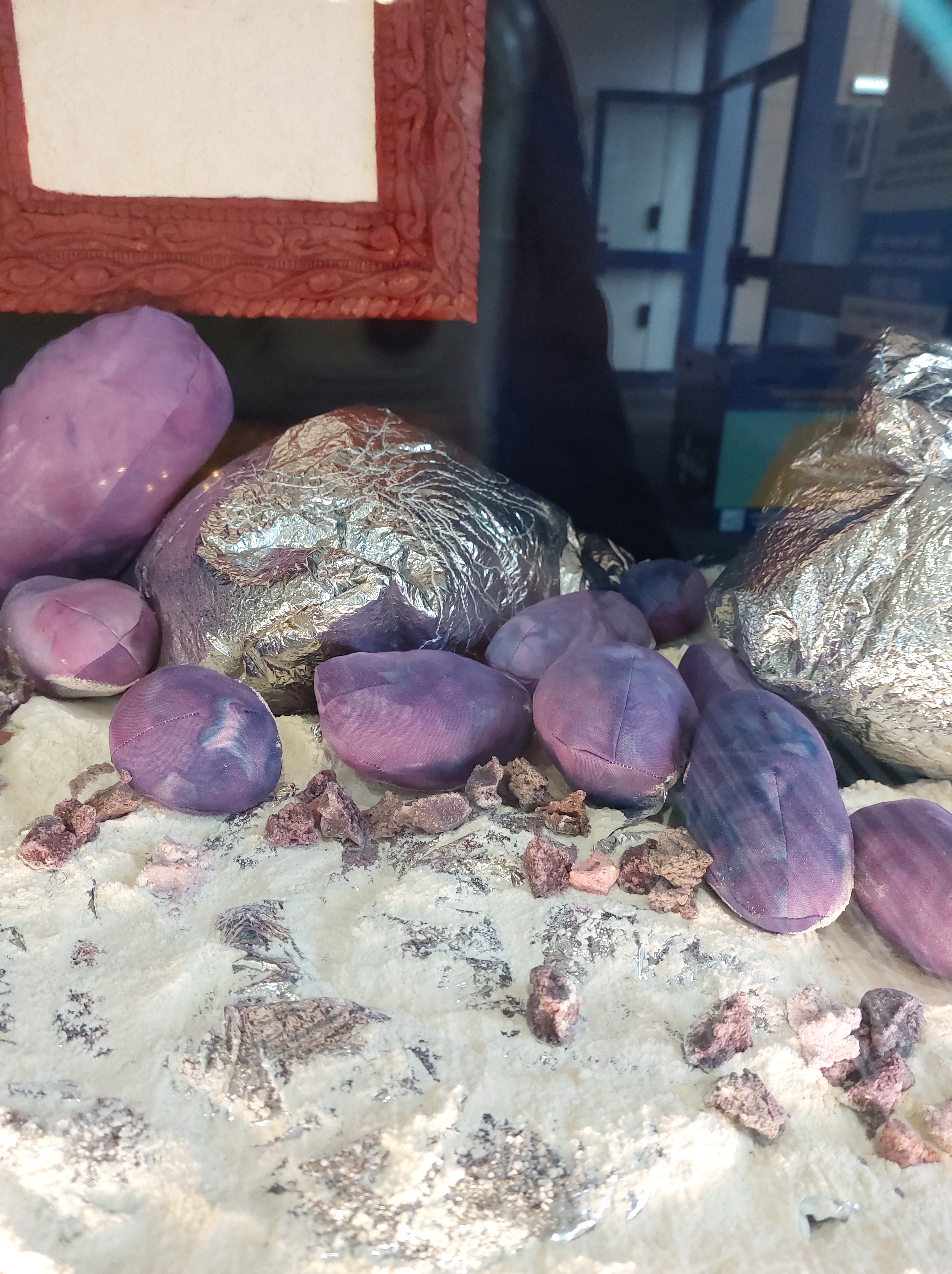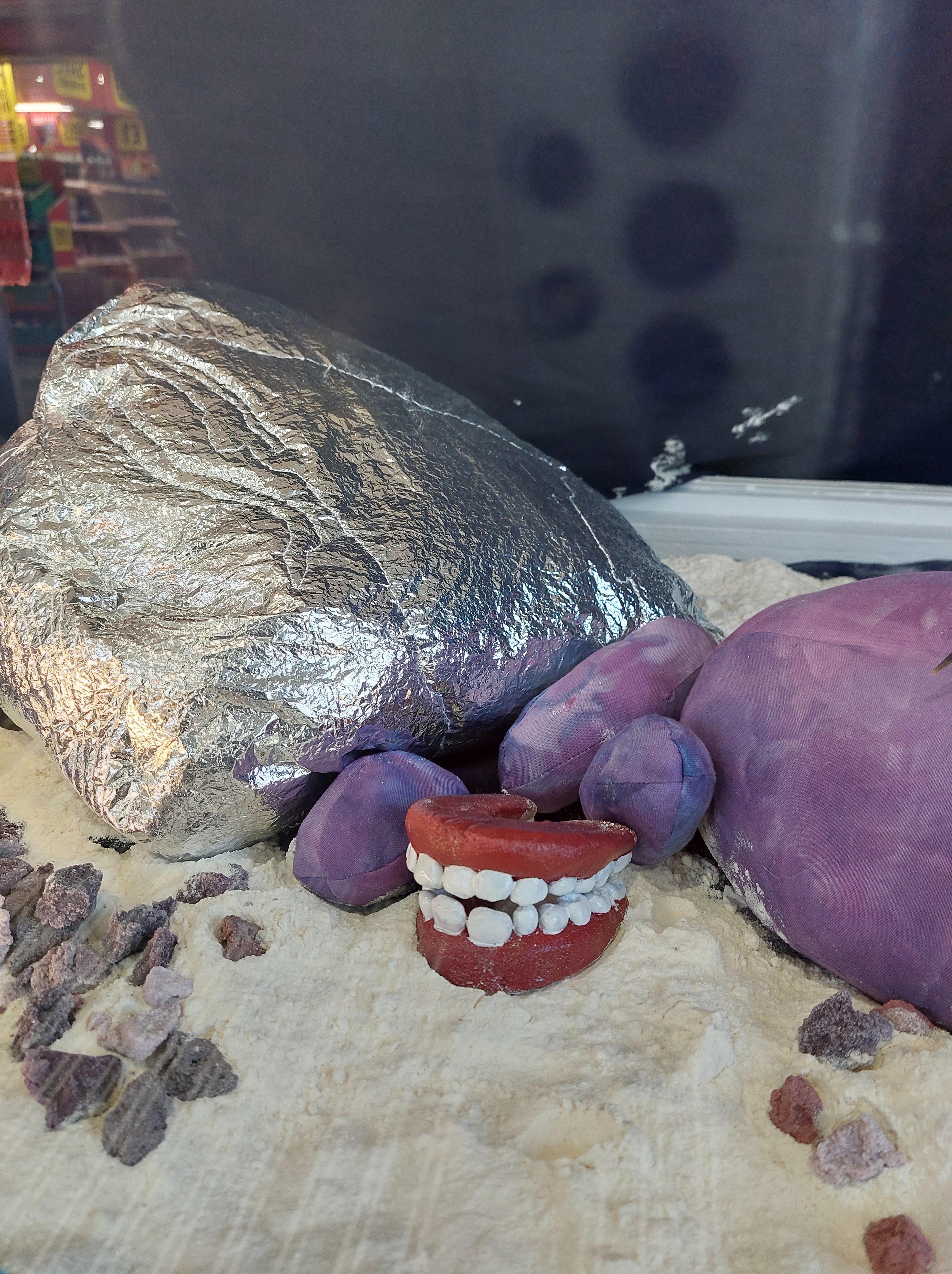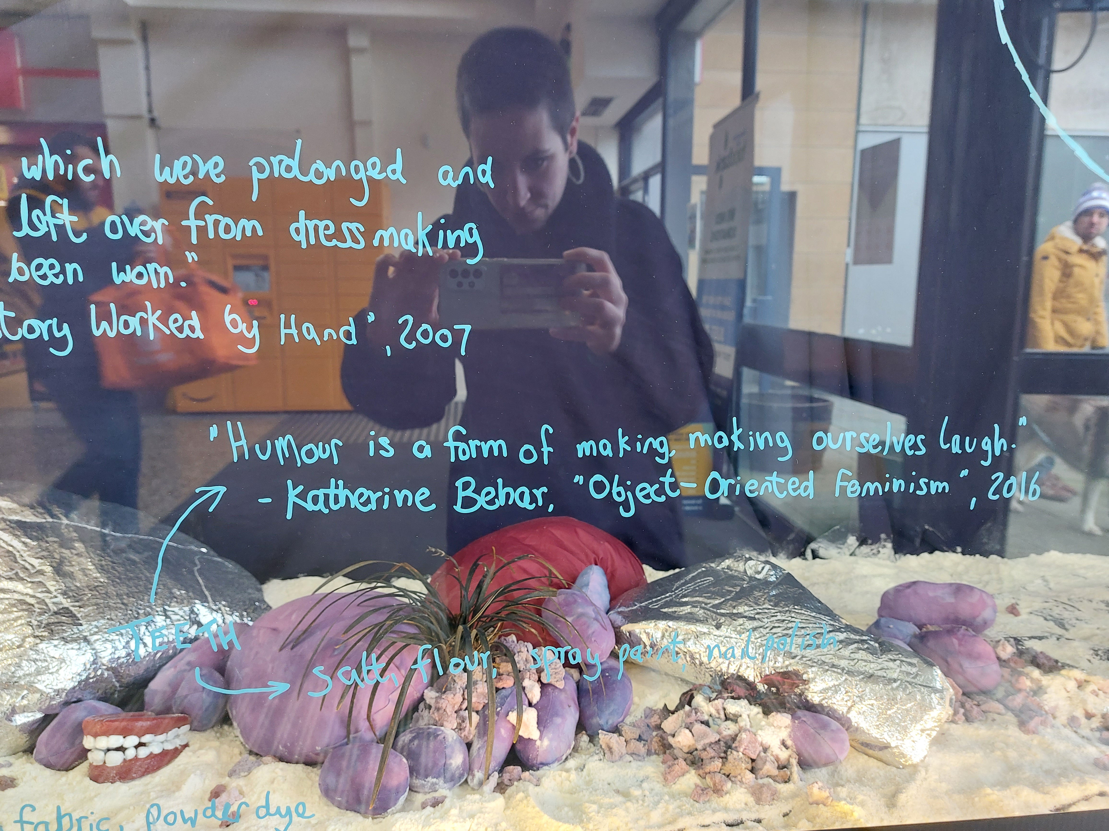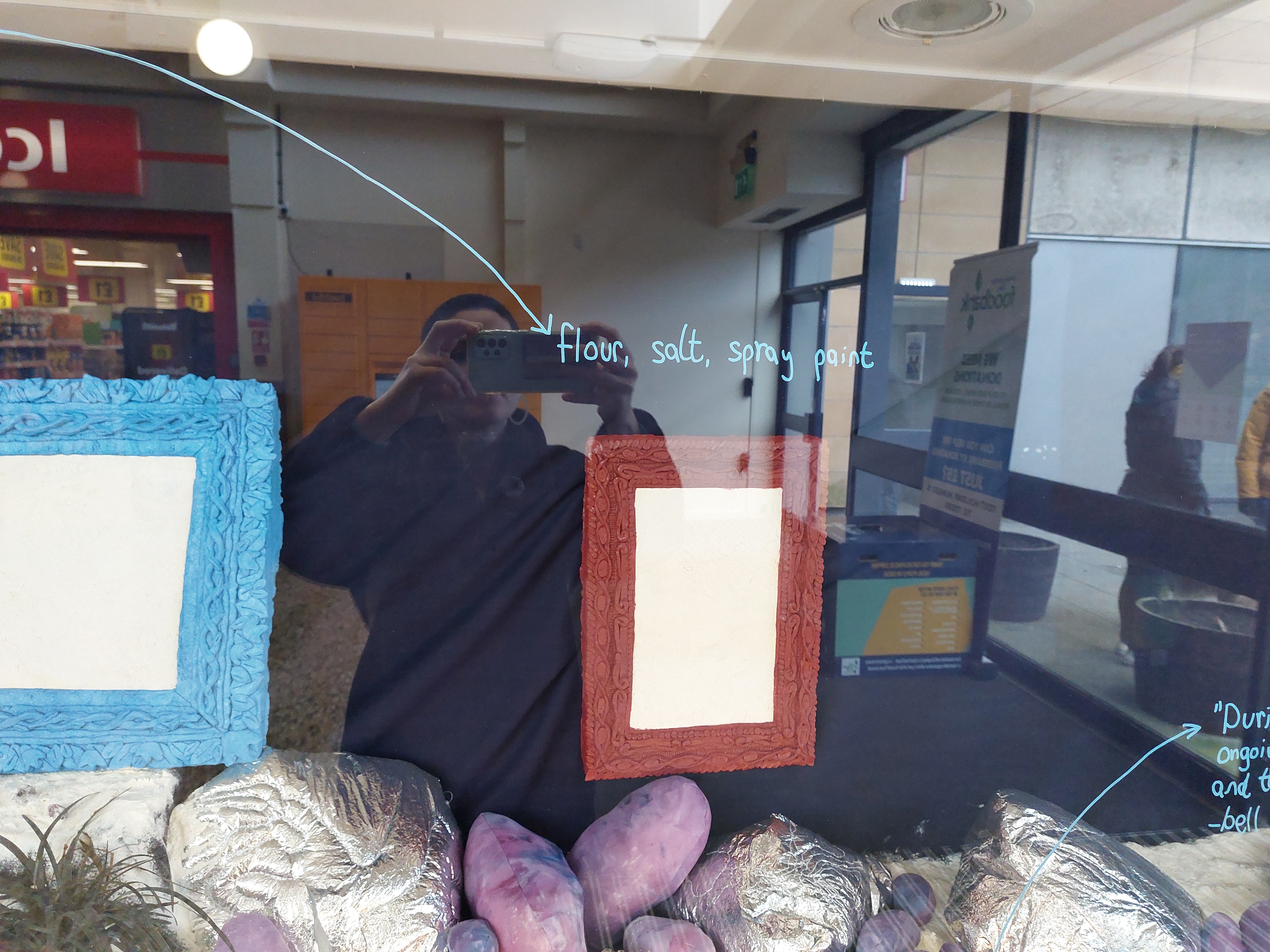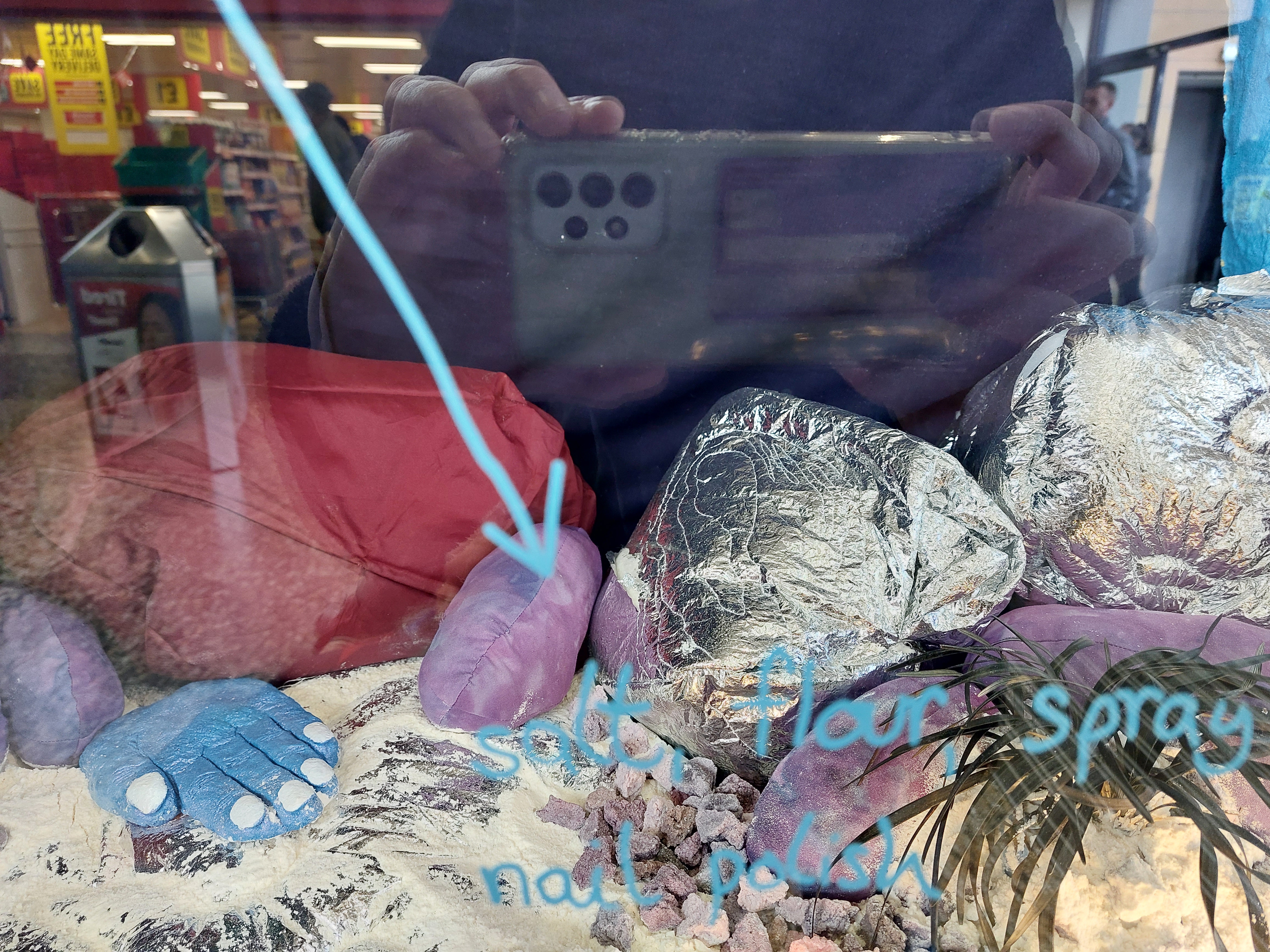 All works were created from materials already in my home: plastic packaging; broken umbrella; quilt batting; powder fabric dye; spray paint; nail polish; thread; salt; flour; water; acrylic paint; live plants; piano backing fabric; old curtain; silver emergency blanket; cotton fabric; bedsheets.